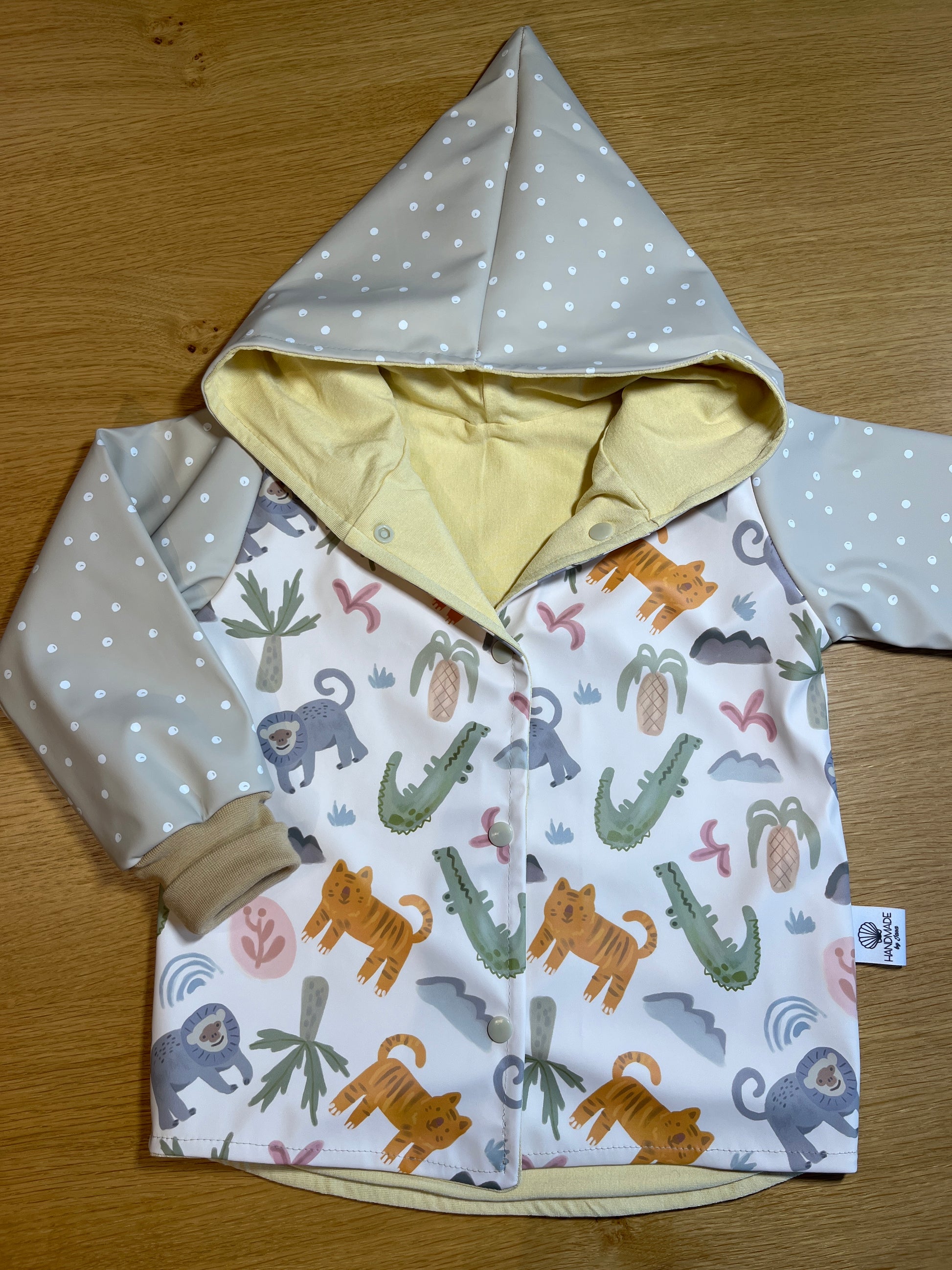 Wunderschöne Regenjacke aus einem wind- und wasserabweisenden dünnen Regenstoff, mit einem weichen Innenfutter. Die angenehme Passform und die Möglichkeit das Armbündchen umzuschlagen, lässt die Jacke ca. eine Größe mitwachsen. Die Bündchen können erst umgeschlagen, später aber auch lang getragen werden. Alle hergestellten Kleidungsstücke sind Unikate.