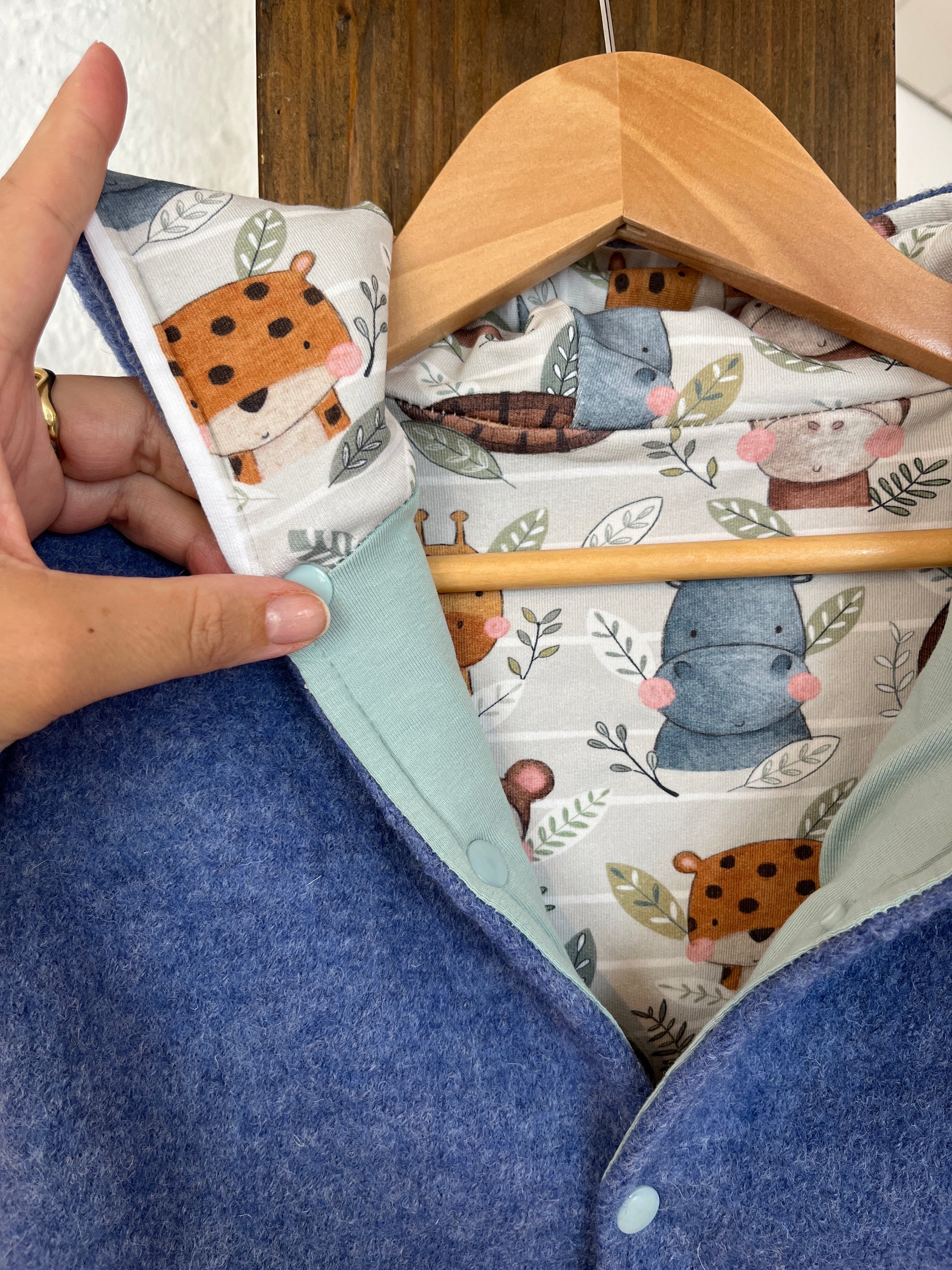 Außen besteht die Jacke aus Wollwalk und innen wird sie mit Jersey oder Musselinstoff gefüttert. Durch die durchgehend versteckte Naht kann die Jacke komplett gewendet werden. Geschlossen wird die Jacke mit praktischen Druckknöpfen, welches das An- und Ausziehen deutlich erleichtert.