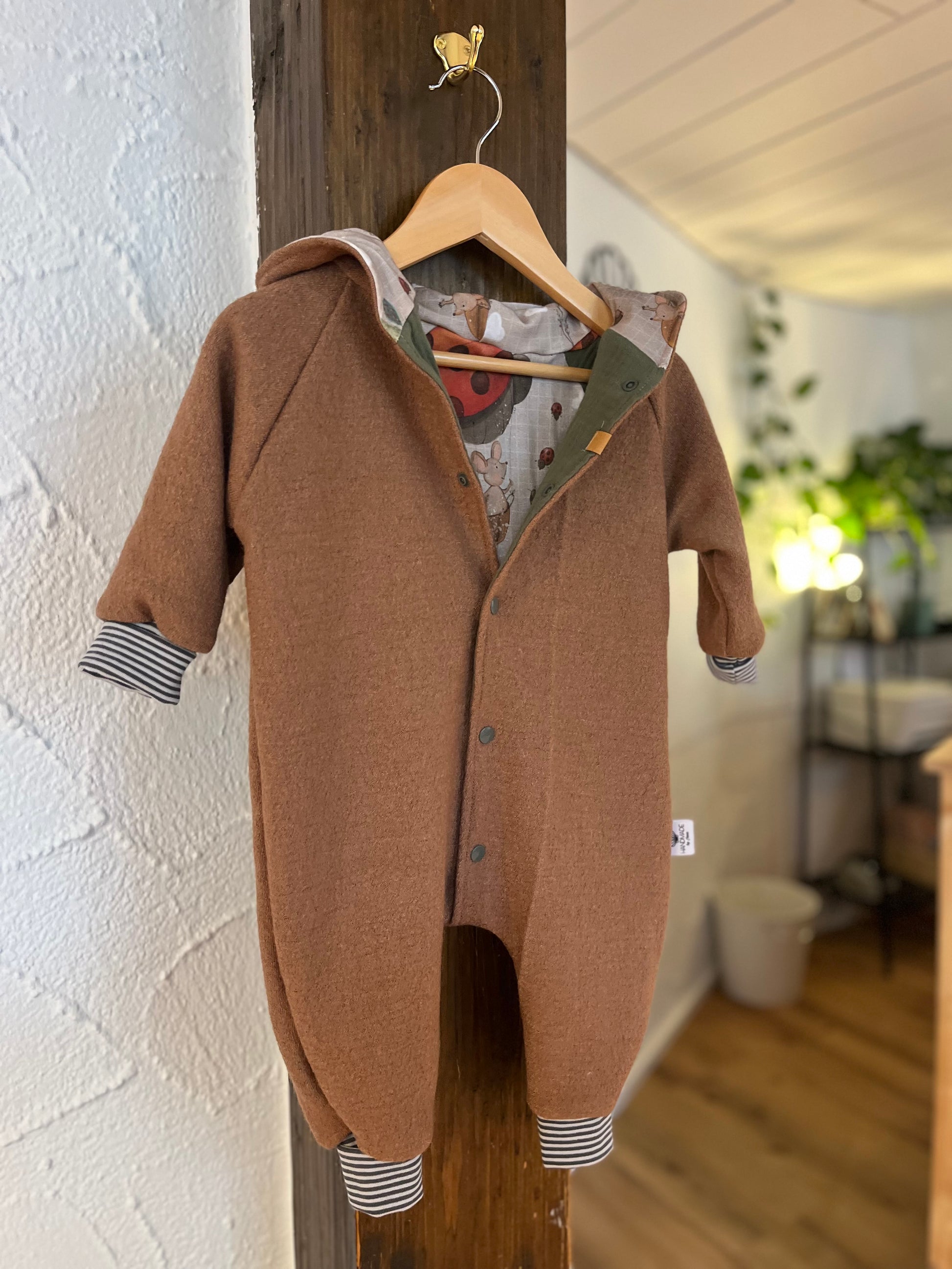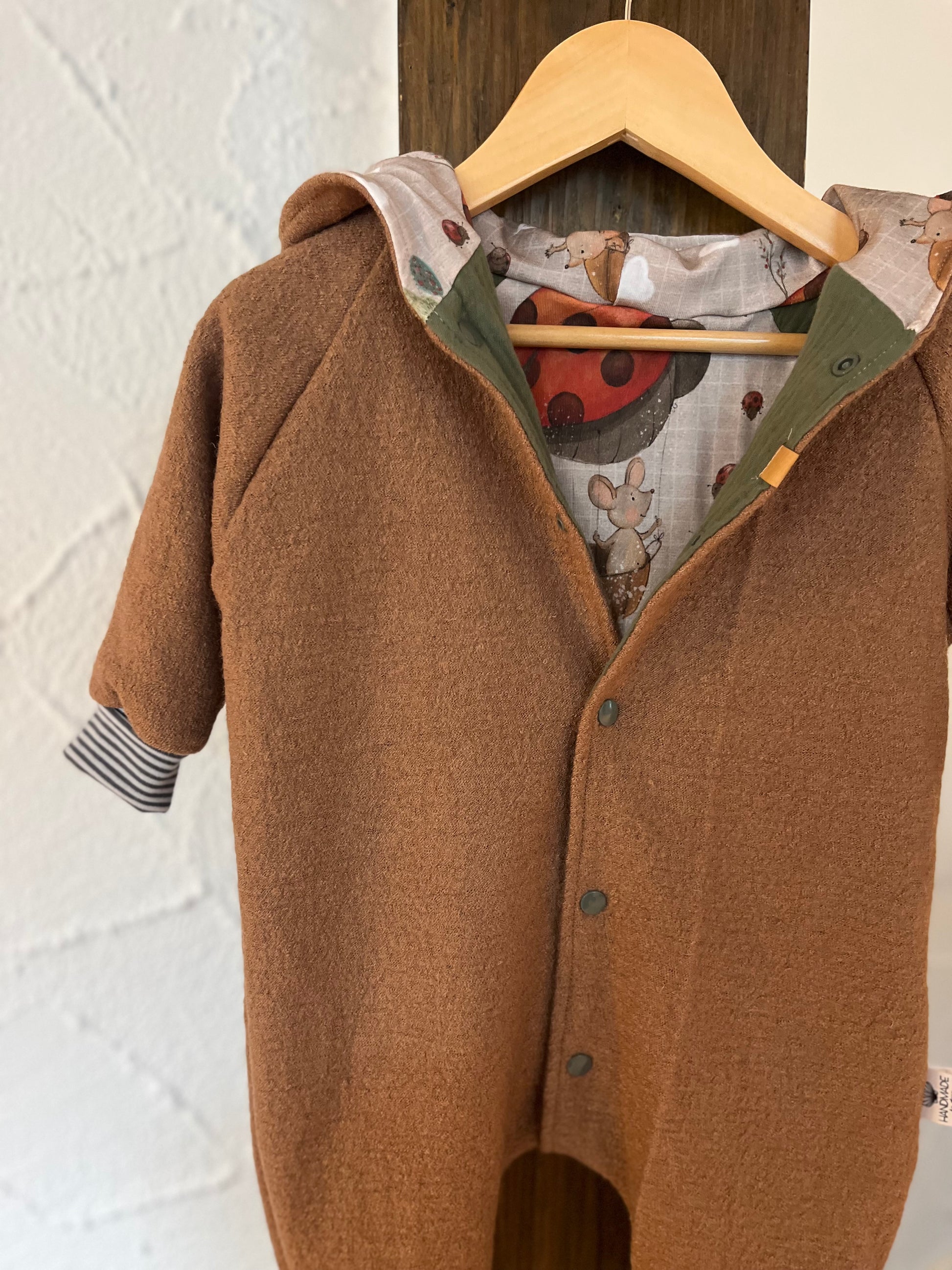 Gemütlicher Overall aus Wollwalk für Babys und Kleinkinder. Dieser ist komplett mit einem weichen Jersey gefüttert. Die Bündchen können am Anfang umgeschlagen werden, so kann der Overall eine Weile mitwachsen. Die Bündchen haben außerdem den Vorteil, dass der Overall nicht an Armen und Beinen hochrutschen. Schurwolle zeichnet sich durch einen hohen Tragekomfort aus. Sie ist robust und langlebig. Dieses temperaturausgleichende und atmungsaktive Material sorgt dafür, dass Dein Kind gut gewärmt ist, ohne zu schwitzen. Schurwolle kann einen hohen Anteil an Feuchtigkeit aufnehmen, ohne sich nass anzufühlen und ist enorm windabweisend.