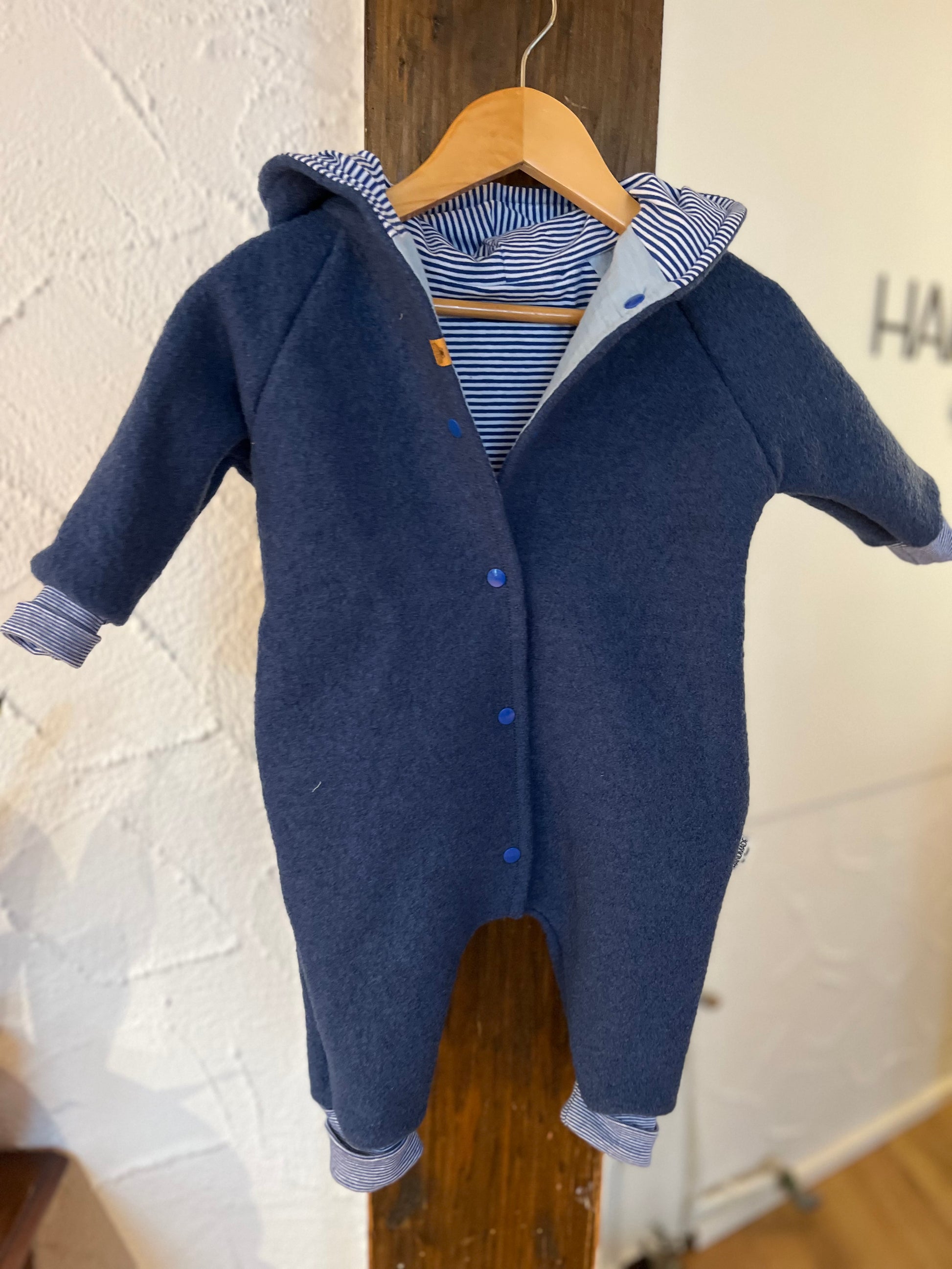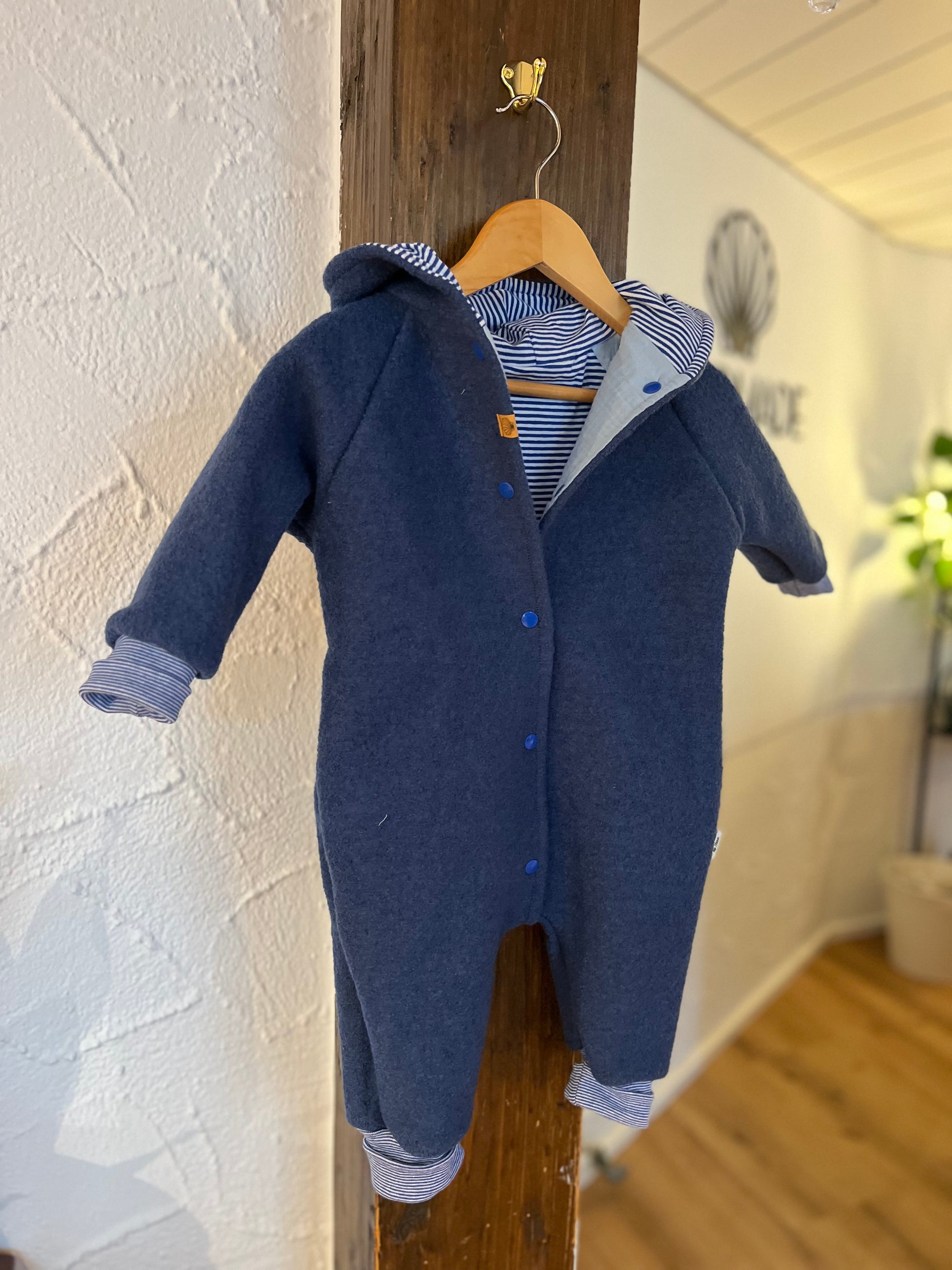 Gemütlicher Overall aus Wollwalk für Babys und Kleinkinder. Dieser ist komplett mit einem weichen Jersey gefüttert. Die Bündchen können am Anfang umgeschlagen werden, so kann der Overall eine Weile mitwachsen. Die Bündchen haben außerdem den Vorteil, dass der Overall nicht an Armen und Beinen hochrutschen. Schurwolle zeichnet sich durch einen hohen Tragekomfort aus. Sie ist robust und langlebig. Dieses temperaturausgleichende und atmungsaktive Material sorgt dafür, dass Dein Kind gut gewärmt ist, ohne zu schwitzen. Schurwolle kann einen hohen Anteil an Feuchtigkeit aufnehmen, ohne sich nass anzufühlen und ist enorm windabweisend.
