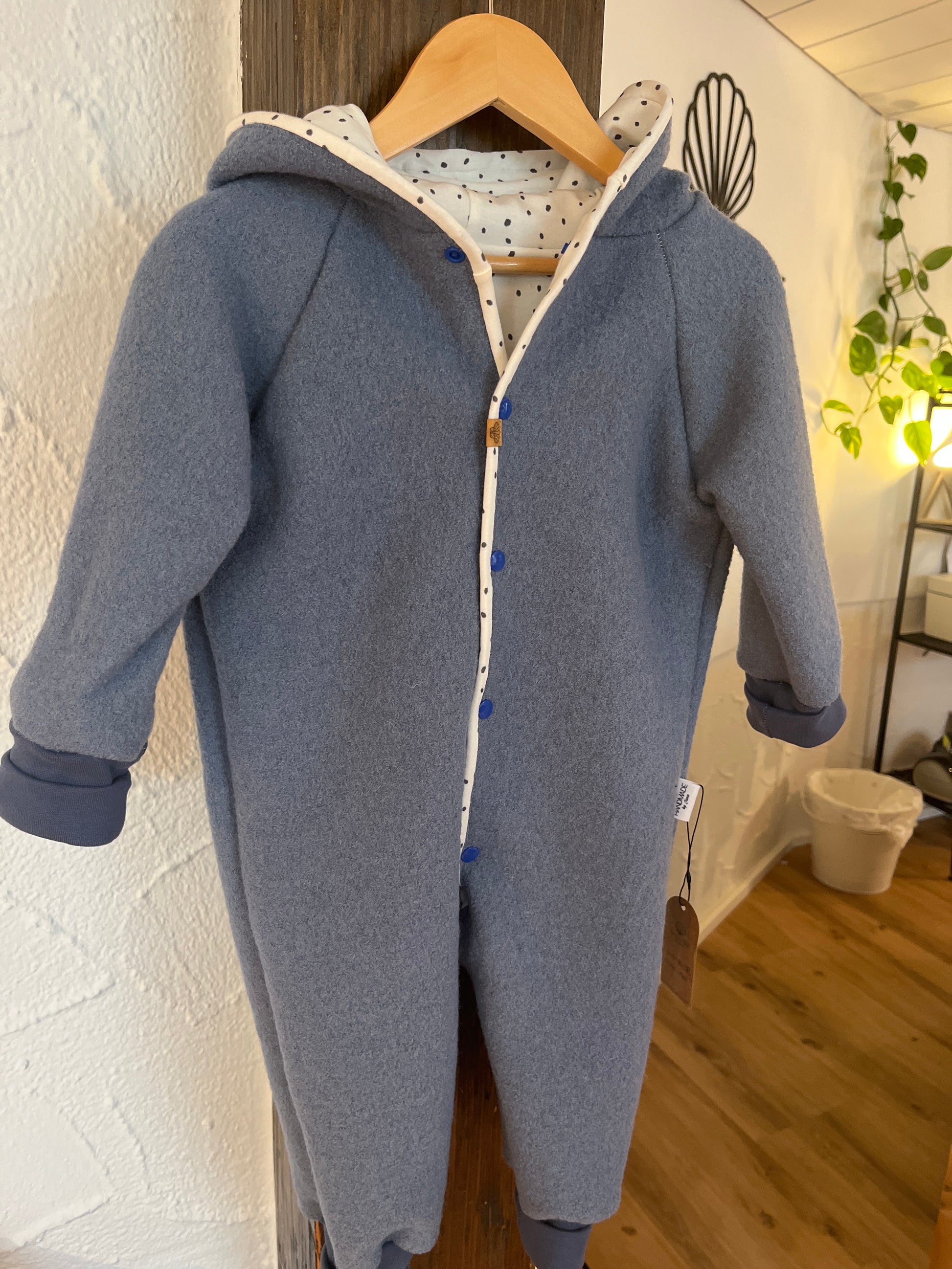 Gemütlicher Overall aus Wollwalk für Babys und Kleinkinder. Dieser ist komplett mit einem weichen Jersey gefüttert. Die Bündchen können am Anfang umgeschlagen werden, so kann der Overall eine Weile mitwachsen. Die Bündchen haben außerdem den Vorteil, dass der Overall nicht an Armen und Beinen hochrutschen. Schurwolle zeichnet sich durch einen hohen Tragekomfort aus. Sie ist robust und langlebig. Dieses temperaturausgleichende und atmungsaktive Material sorgt dafür, dass Dein Kind gut gewärmt ist, ohne zu schwitzen. Schurwolle kann einen hohen Anteil an Feuchtigkeit aufnehmen, ohne sich nass anzufühlen und ist enorm windabweisend.